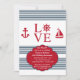 En livlig, nautisk årsdagsinbjudan för älskande och sjömän. Den vita bakgrunden har blåa ränder och röda nautiska motiv. Ordet kärlek har ett roder i stället för bokstaven "o". (FP)