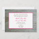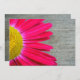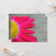 En roligt och en livfull bröllopsinbjudning med ett foto av en shock rosa som söker från lämnat sida över en bakgrund av barnträ. Motsatt sida har barnträbakgrund med text i mitten i en vit rektangel som är skisserad i shock rosa som matchar daisyn. Anpassa med information om tillfälle. Det är från brudens föräldrar.