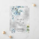 En modern och elegant kallad bröllopsinbjudan med dammiga blommar av blå peony mot en silver-vattenfärg tvättar bakgrunden med ett livligt slitsteckensnitt.
