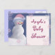 Cute snögubbe med rosa hatt och rosa och blått snöflingor med babykläder. Byt enkelt fram och tillbaka till perfektens vinterduschtema. Se tusentals baby, monogram och inbjudningar frimärke och kort.