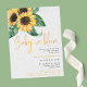 En inbjudan till en babydusch i Bloom-temat med vattenfärgade solblommor och löv. "Baby in bloom" är i gult ett modernt handskrivet stil-teckensnitt. Anpassa med dina detaljer.
