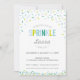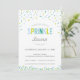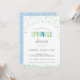 Söta Baby Sprinkle-inbjudan i ett blått och grönt färg, med färgstarka sprinkler. Den här designen är perfekt för Baby Sprinkle eller för alla firande med ett sprinklertema.