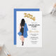 Studentfest Inbjudan till kvinnlig svart klänning porträtt teckning, blått lock och grå, långa mörk hår. 2023 guld-ballonger.