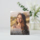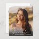 Elegantens budgetvänliga inbjudan till studentfest med gradens foto överlagrad med "student" i ett modernt vitt skript och deras namn och klassår i vanlig vit typografi. På baksidan lägger du till informationen om grad party.