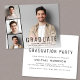 Ett budgetvänligt, modernt tillkännagivande och en partiinbjudan från studenten som innehåller student överlagrad med tre mindre kvadratfoton och "Student" deras namn, skolår och klassår i enkel typografi. Lägg till studentfesten på baksidan.