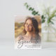Gratulera till att student har lyckats med det budgetvänliga tillkännagivandet och inbjudan till studenten i snyggten. Hennes foto fyller kortet, överlagrad med "Student" i ett elegant-skript, under vilket hon lägger till namn, skola och klassår. På baksidan lägger du till ytterligare ett foto och en studentfest eller öppen hemadress.