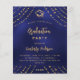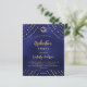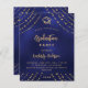 En marin blå bakgrund som dekoreras med faux guld-stjärnor och en sockel. Den blå färg är ojämn. Anpassa och lägg till namn, party och årtal. Texten Studenten och namn är skrivna med ett modernt handskript i stil. 1 lakan = 1 inbjudan tryckt kant till kant.