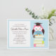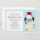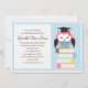 Späd barnens inbjudan till studentfest med en rosa uggla sitta på en stapel i bokar. Grafik ©Babystar Design.