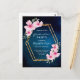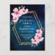 Ett tropiskt temat studenten-inflygning. Med ett faux guld geometric ram dekorerat med rosa hibiscus, blommor tropiska blommigtar med en viss grad av grönenergi. En mörk blått tropisk natt himmel som bakgrund. Texten: Studenten och namn är skrivna med ett modernt, hanterat stil-skript. Vit text. Tips! Om du inte vill att det ska se ut som ett vykort klickar du på anpassa, går till baksidan och tar bort delaren och lägger till frimärke.
