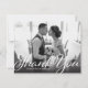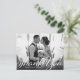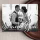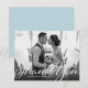 Ett skript i vintage stil och en gradient för mörk överträffar ditt favoritfoto av tacksamhet i bröllop. Använda det tomma utrymmet på baksidan för att skicka skriva ett personligt meddelande till vänner och familj. Den här designen kan anpassas till antingen liggande eller porträtt fotolayouter.