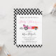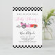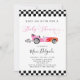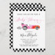 Kortet för kallduschinbjudan till biltemat för barn i tävling, som visar en bild av rosa vintage bil med lågor. I texten står det "tävling på för en babydusch". Perfekt för din flickas babydusch.