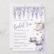 Elegant lila lavender blommigt möhippa te party, inbjudningskort för möhippan med söt tekanna och kopp.
