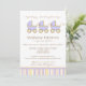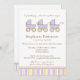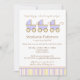 Tredubbla glädjen! Det är meddelandet på den här babyduschinbjudan som innehåller tre vidsträckta blå baby-vagnar med koordinerande blått, gult och brunt rand mot en vit bakgrund.