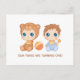 Söta tecknade bebisar i romers. Den till vänster är klädd i en brun björn-overall med en gul halsduk med en liten bin. Den till höger är klädd i en blå romer med gul halsduk och håller i en baby skallra. Ljus boll vilar mellan dem.