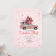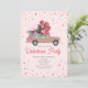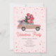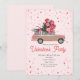 En inbjudan till valentinsfest med en illustration av en rosa SUV-lastbil i träpanel med jätte stor rosbukett. Bakgrunden är ljusrosa med konfetti.