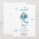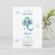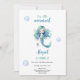 En kallelse till vattenfärgsblå sjöjungfru Whimsical och roligt under temat födelsedagsfest inbjudan mallkort med regnbåge i färg sjöjungfru svan med flodvågor i guld glitter. Texten längst upp säger "Vår lilla sjöjungfru". Roligt party tema för en flickas födelsedag.