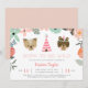 En bra barnduschinbjudan till din vild en på vägen har en boho blommigt gräns, ett par sött skogar baby djur och en rosa teepeelare. "Born för att bli vild" visas i persikobokstäver, med information om babyduschen under. Kort går tillbaka till fast rosa.