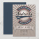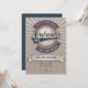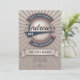 Baseboll inbjudan har en vintage-inspirerad baseboll-illustration, anpassad med namn, understruken med en svans. Denna design inkluderar element i blått, rött, en baseboll, banderoller och en stjärnexplosion i bakgrunden. Mall för personlig anpassning, inklusive ålder eller spelarens nummer.