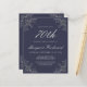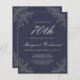 Den här elegant vintage-inspirerade födelsedagsfest inbjudan innehåller texten i silver grått-skript och serif typsnitt på en mörk marin blå bakgrund, framtagen av ornate dekorative silver grått-motiv i alla fyra hörnen. Hörnmotiven upprepas i motsatt riktning.