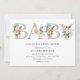 Babyduschinbjudan med "baby" i elegant guld brev med vintergröna och pinsekon. Perfekt för vintern baby. Anpassa med din information.