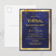 På framsidan: Ett trendig, ett modernt 50:e (eller någon ålder) virtuellt födelsedagsfest inbjudan-kort för manar. En mörk blått, marin blå bakgrund. Den blå färg är ojämn. Med faux guld ram och guldkonetti, gyllene färgad brev. Anpassa och lägg till information om namn, ålder och party. Bakåt: vanlig vykortsdesign.