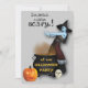 Här är en roligt Halloween-festinbjudan! På framsidan finns en realistisk zombie som häxa med armen utdragen över en röktäckande svart kuldron. Sitt bredvid den kokande kålen sitter en orange jack av tänderna och en grumlande vit skalle. Den stiliserade texten på toppen säger i svart: "Ät, drick och var läskigt!" På korgen står det "vid vår Halloween fest" och "vid vår orange". bilder och text placeras på en lätt grått-bakgrund. Baksidan av inbjudan har samma grått-bakgrund, med den anpassade texten svart. Cute, och enkelt att anpassa för att säga vad du vill.
