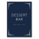 Denna eleganta bordsskylt för bröllop har en djupblå bakgrund med knivskarpt vit text och dekorativa element. Designen visar orden "DESSERT BAR" i feta, versaler, följt av en vänlig inbjudan att "ta en godis!" i en mindre font. Geometriska Art Deco-mönster inramar varje hörn och tillför en touch av sofistikation. Den moderna minimalistiska stilen skapar en inbjudande atmosfär, perfekt för att uppmuntra gästerna att unna sig söta godsaker på din fest.