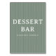 Denna bröllopsdekoration har en minimalistisk design med vertikala ränder i dämpade gröna nyanser, vilket skapar en subtil men elegant bakgrund. Den rena, moderna typografin visar framträdande "DESSERT BAR" i feta versaler, följt av den inbjudande frasen "PLEASE HELP YOURSELF!" i ett lättare typsnitt. Den övergripande stilen är modern och tilltalande, perfekt för att skapa en avspänd och vänlig atmosfär på ditt evenemang. Dess enkla komposition och effektiva användning av negativt utrymme säkerställer tydlig kommunikation samtidigt som den visuella appellen bibehålls.