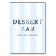 Denna bröllopsdekoration har en ren, minimalistisk design med vertikala ränder i mjuka nyanser av blått som skapar en lugn och inbjudande atmosfär. Den feta serif-stilen för "DESSERTBAR" kompletteras av ett vänligt sans-serif-meddelande nedan som uppmanar gästerna att unna sig själva. Den enkla layouten betonar klarhet och elegans, vilket gör den perfekt för att guida gäster till de söta godsakerna på ditt evenemang. Dess moderna stil och lugnande färgpalett lägger till en touch av sofistikation samtidigt som den behåller en avslappnad atmosfär som är idealisk för alla dessertstationer.