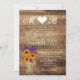 Mallen för inbjudan för bröllop för den lantliga landladugården skorrar den Wood med mörk lila blommor och solrosor i en mason med den brud- och brudgum initialer med en hjärta upptill. Dessa unika landsbyggsbröllopinbjudningar är perfekta för något lantligt themed bröllop. Parets initialer och hjärta är också på baksidaen av inbjudan på den lantliga wood designbakgrunden.