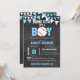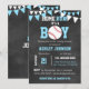 Enorma unika kort för inbjudningar för baseballtemababy shower. Svart tavlabakgrund med baseballHEMSPRINGA! - Dess en pojke. Blått- och vitfärger. Redigerbara mallkort så du kan tillfoga din information. Få matcha klistermärkear för dina gåvafavörer.