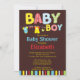 Starta din barndusch från pojke med högerna med vår söta och färgstarka kallduschinbjudan till barnsköljen i pojke. Vår moderna inbjudan till pojke har en söt barnkläder-tvätt-garderoll med en baby-romer, bib och sockor med stora, skarpa, skarpa bokstäver på en brun bakgrund med blå gult röd och grönt rand gräns och baksida. ©Blackleaf Designs
