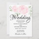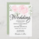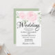 Mjuk rosa ros omgiven av grönt löv smälter nästan in i den vita bakgrunden. Bröllop är skrivet i ett stort skript med närmare uppgifter om bröllop nedan. Baksidan av inbjudan är en mjuk grönt med ett tips om löv mönster.