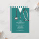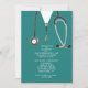 Kreativa inbjudningar till medicinska skolavslutningar med sjukhusskjortor och stetoskop konst. Redigera texten för att skapa en unik inbjudan till doktorsfest.