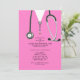Kreativa inbjudningar till doktorsavslutningfest med rosa sjukhusskjortor och stetoskop. Redigera texten för att skapa en unik inbjudan till doktorsfest eller medicinskola-examensannonsering.