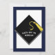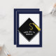 Kreativa inbjudningar till examensfest för examenklass 2025 med svart hatt och gul tofs på marinblå bakgrund.