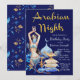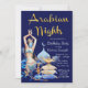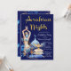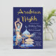 Inbjudningskort till fester med tusentals och en natt-tema med vackra blå och guldillustrationer på en kunglig blå bakgrund. Denna underbara inbjudan till födelsedagsfest och evenemang med tusentals och en natt-tema kan enkelt anpassas för ditt evenemang genom att helt enkelt lägga till dina uppgifter. Du kan också ändra bakgrundsfärgen. Detta är en tryckt design utan verklig glitter, folie etc.