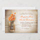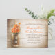 Romantisk rustisk träbakgrund och Mason burk med inbjudningar till orange blommor förlovningsfest. Jag föreslår texturerad linne papprare för den här designen.