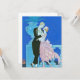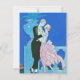 Midnatt Kiss Art Deco-inbjudningar. Art Deco-illustration från 1921. Den Fransk konstnären Georges Barbier var berömd för sin vackra och livliga bild av det parisiska nattlivet. Midnatt Kiss skildrar ett par som står på en balkong och ser över floden som en båt seglar förbi i avstånd. Mannen bär en svart tuxedo och lutar sig in för en kyss medan kvinnan bär en kylig rosa, rosa och rosa håravfall. Två blå duvor flyger över dem till natten himlar. En romantisk gåva till fläkt av Georges Barbier, Art Deco och Vintage Paris.