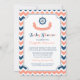 Personlig nautisk temusduschinbjudan i elegant och modern mörk marin blått, persiko-orangens rosa och vit roligt chevron zigzags mönster med fraktens hjul och banderoll. Anpassade med din text, kontakta oss för att begära en ändring av färg.
