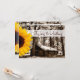 Det här fotografiet av rustiska land i sepia har en gammal jägares logghytt i skogen sitta under långa träd i gräs. Fotot har en sepiisk färgad som ge det ett rustiskt utseende. Det har en ljusstark gult solrosa på designens sida. På ena sidan av inbjudan till det rustiska landsbyggsbröllopet finns bruden och rummen namn över ett genomskinligt rand nära överkanten. Den andra sidan av den roliga bröllopsinbjudningen har samma sura logingscen i gräs träd och solros med bröllopsinbjudningarna.