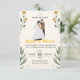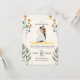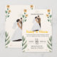 Fira kärlek med denna söta och stilrena bröllopsinbjudan med en illustrerad brud och brudgum omgiven av ömtåliga blommor och bladdekorationer. De varma, jordnära färgerna i kombination med lekfull typografi skapar en charmig och modern känsla – perfekt för par som planerar ett avkopplat, trädgårds- eller familjeinriktat bröllop.