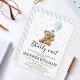 Cute brun nalle med blå ballonginbjudan till babydusch. Nalle för vattenfärg för pojke-dusch.
