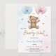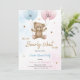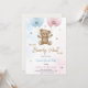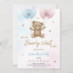 "Inbjudningskort till en könsrevealeringsfest med en söt teddybjörn som håller i blåa och rosa ballonger. Texten lyder 'Han eller hon, vi kan knappt vänta på att se.' Designen är lekfull och välkomnande. Kortet innehåller festdetaljer längst ner."