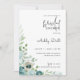 Minimalistiskt inbjudningskort för möhippan med dammiga blå och gröna blommor och löv