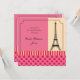 Elegant och chic fransk themed inbjudan. Presenterar en teckning av det Eiffel torn i en rosa och lagar mat med grädde bakgrund. Randar och polka dotsmönster ger denna design en modern look. Fynd som matchar produkter i detta lager.