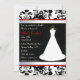 Formell inbjudningskort för möhippan som göras i en svart, damastast mönster för vit, på det bästa och nedersta. En älskvärd bröllopsklänning på ett dekorativt stativ dekorerar rätsidan av inbjudan, och den röda gränsen kantar tittar band för vit ett satäng, på varje sida av det svart textområdet. Skräddarsy texten för att passa dina partybehov.