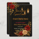 En elegant lyxig inbjudningskort med svart bakgrund infattad i metalliskt guld och glänsande accenter. Hörnen är vackert dekorerade med akvarellrosor i rik röd och mjuk elfenbensvit färg, tillsammans med blad i guld för en glamourös touch. Hängande lyktor i guld upptill ger ett varmt sken och skapar en sofistikerad atmosfär. Det tomma mittutrymmet möjliggör fullständig anpassning av dina evenemangsuppgifter. Perfekt för bröllop, årsdagar, galor, förlovningar eller någon kvällsfirande.
