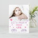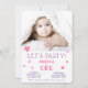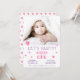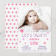 Inbjudningskort till 1-års födelsedagsfest för en babyflicka eller en babypojke. Sött fotofirst födelsedagskort. Kortet har söta rosa stjärnor på framsidan och på baksidan. Designen har ett foto - infoga ditt foto i mallen och anpassa kortet med dina detaljer. Bjud in din familj och vänner till ditt barns första födelsedagsfest.