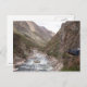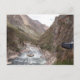 Brevkort från Inca-rälsens blå tåg från Cusco till Machu Picchu genom Helig Valley eller Urubamba Valley med stora berg och Urubamba-floden i Peru.